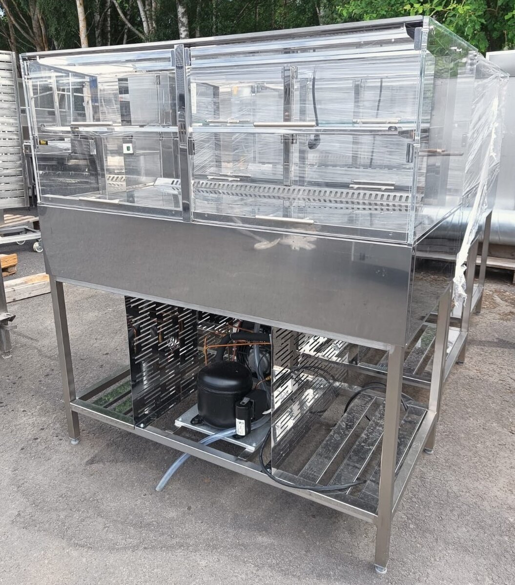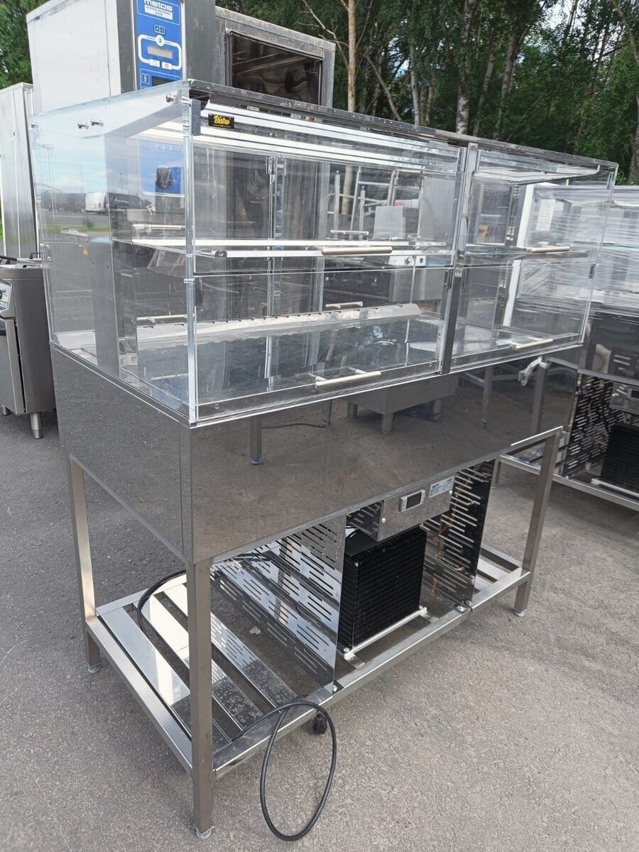 Todella siistikuntoinen Bistron kahvilalasikko yhdellä hyllyllä. Luukut molemmin puolin.